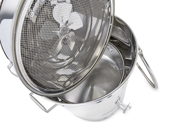 Separerar automatiskt vaxet från honungen med hjälp av värmeelementet med fläkt inbyggt i locket – utan att honungen överhettas. Fläkten säkerställer jämn värmefördelning över hela ytan av vax-honungblandningen. Den perfekta apparaten för biodlare som använder en avtäckningsmaskin eller avtäckningskniv och därmed har större mängder avtäckningsvax blandat med honung som ska bearbetas. Tillverkad av rostfritt stål!