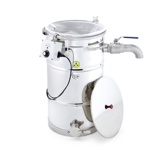 Värmeelementet DANA api THERMA II måste vara inställt på 60-65C, så att honungen kan rinna igenom snabbt. Det övre utloppet måste vara öppet och du kan fylla den finfiltrerade honungen i tunnor eller andra behållare.