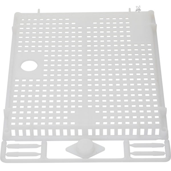 Ta bort bina från ramen. På ena sidan av buren finns 4 plastspikar och en liten plugg. I varje hörn av buren finns ett hål där spikarna ska placeras. Buren kan sedan fästas på yngelbrädan.