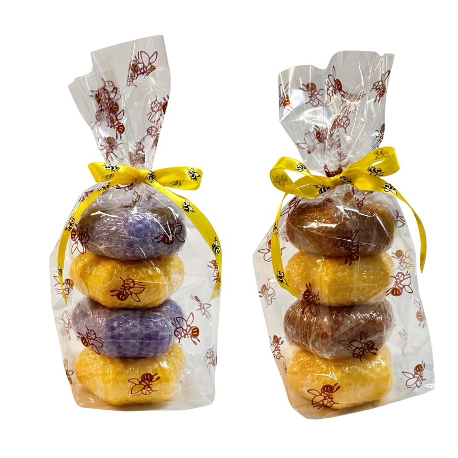 De är fint inpackade i cellofan med satinband med bimotiv.