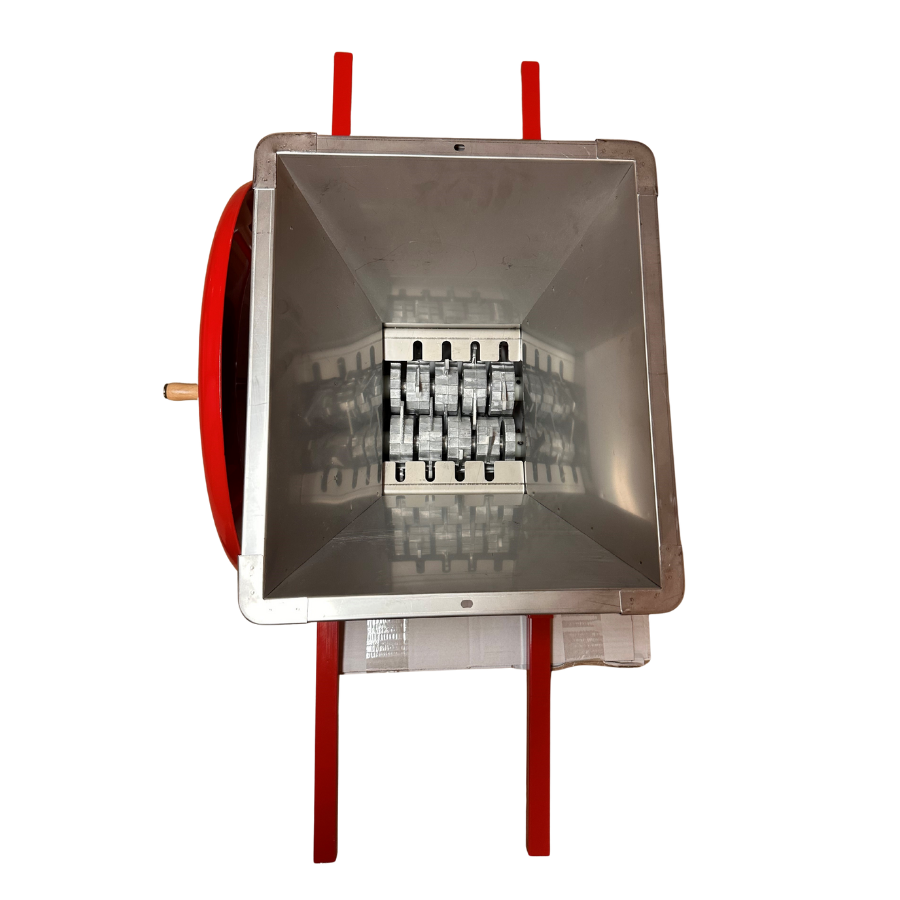 Tack vare det stora vevhjulet skapas ett stort moment, vilket gör att det inte krävs fysisk styrka för att krossa frukten snabbt och effektivt. Vassa och kraftiga knivar fångar frukten och kör den igenom valsarna.