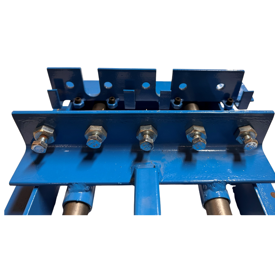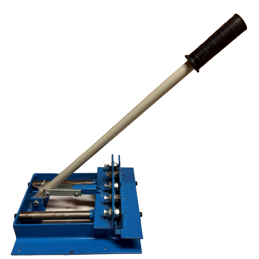Hålstansen gör 5 hål åt gången (eller färre beroende på lamellens längd) på jämnt avstånd, både på de smidda ramarna och på de enskilda sidolisterna.