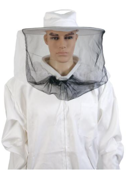Vit nylonslöja synfält i svart tyll som är fastsydd på hattens ytterkant.