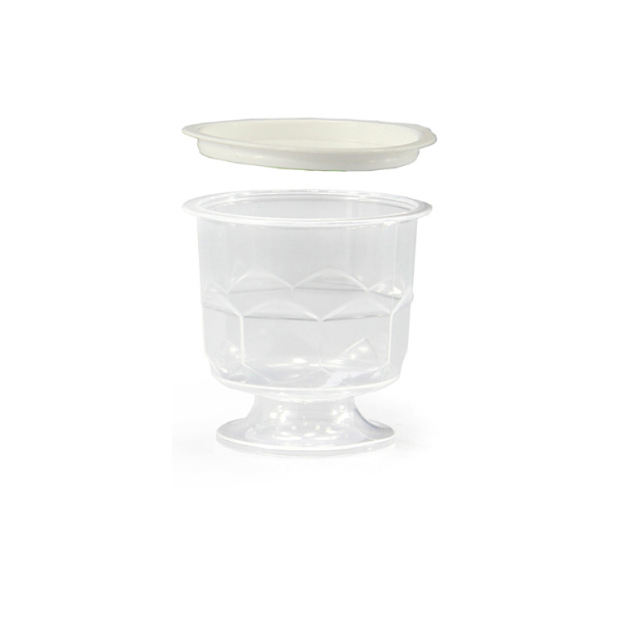 Transparenta burkar med vita lock är tillverkade av formsprutad polypropen, lämpliga för kontakt med livsmedel.